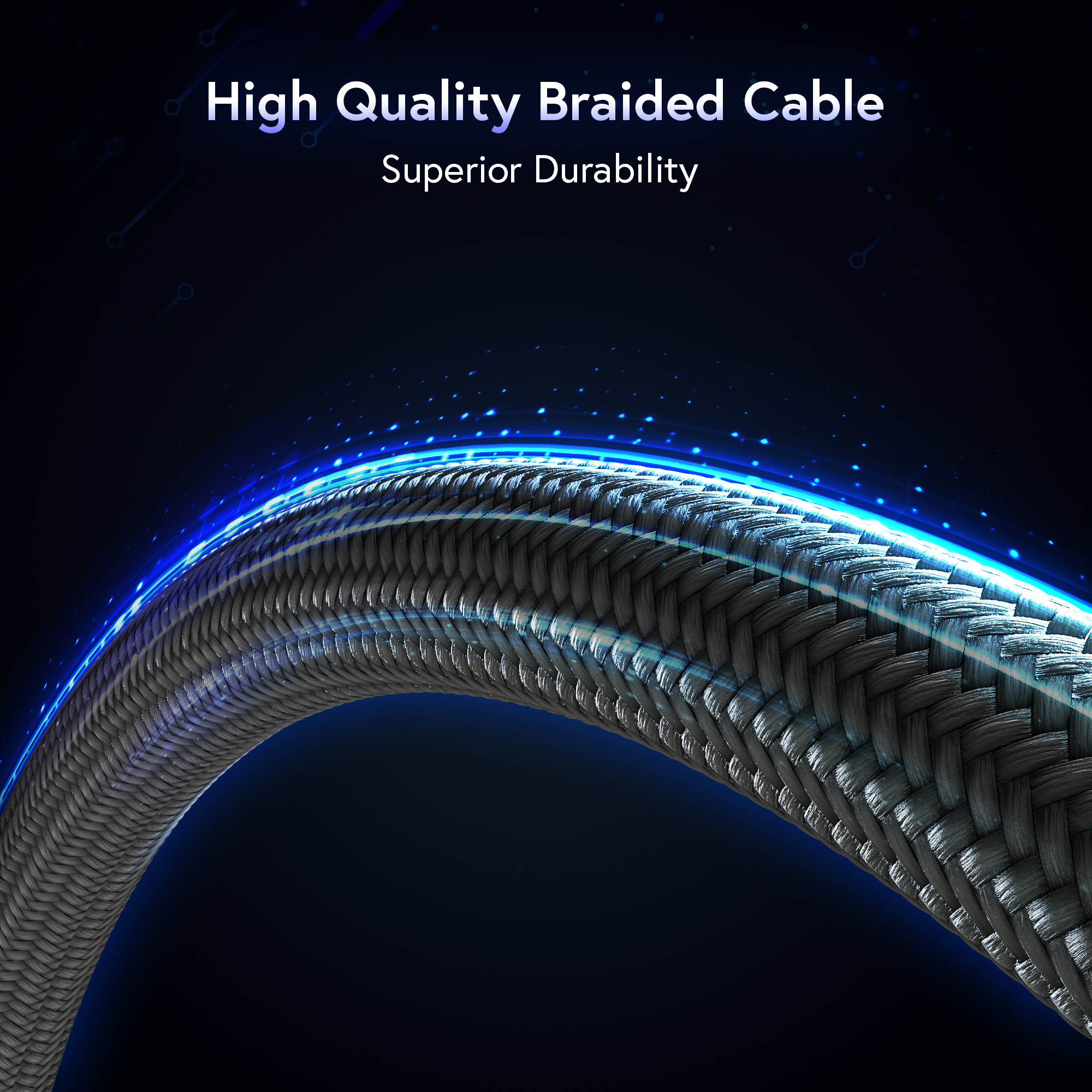 gamers. Its durable braided nylon exterior and anodized aluminum